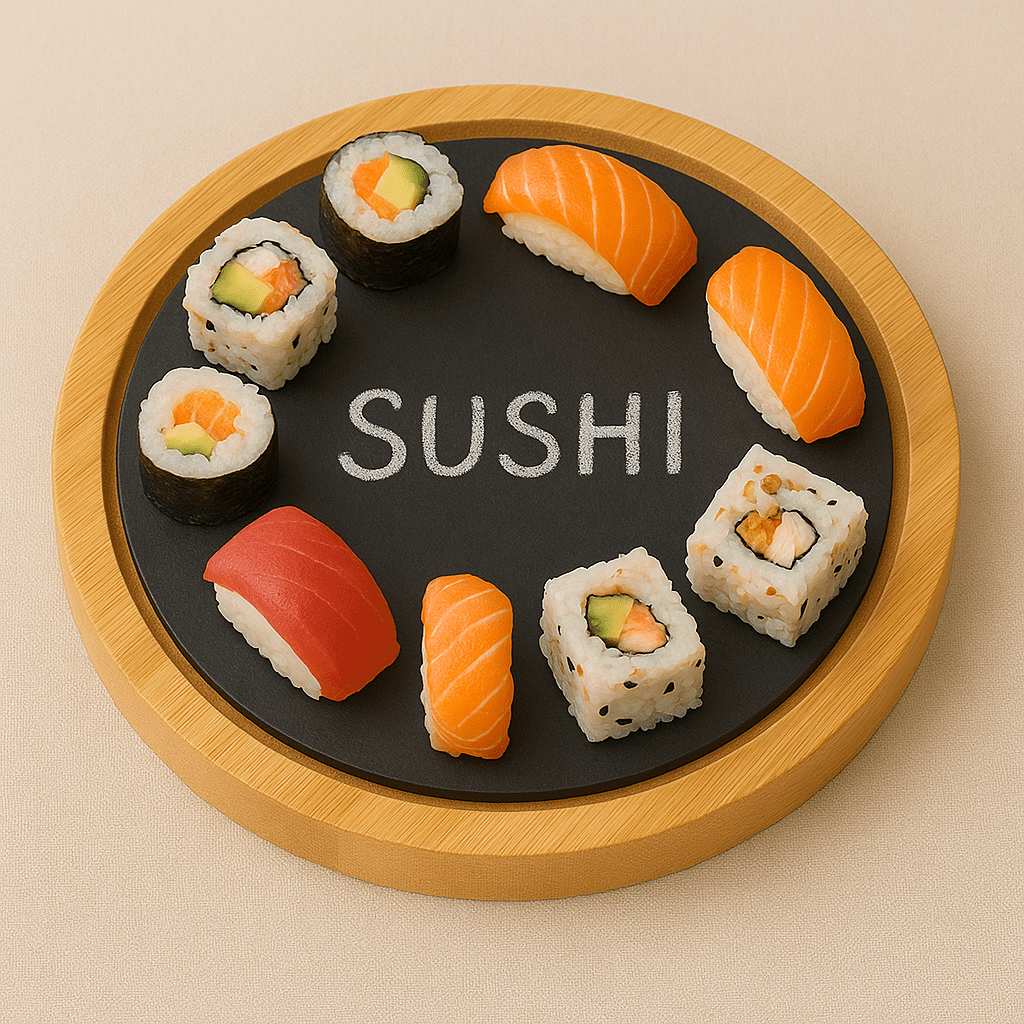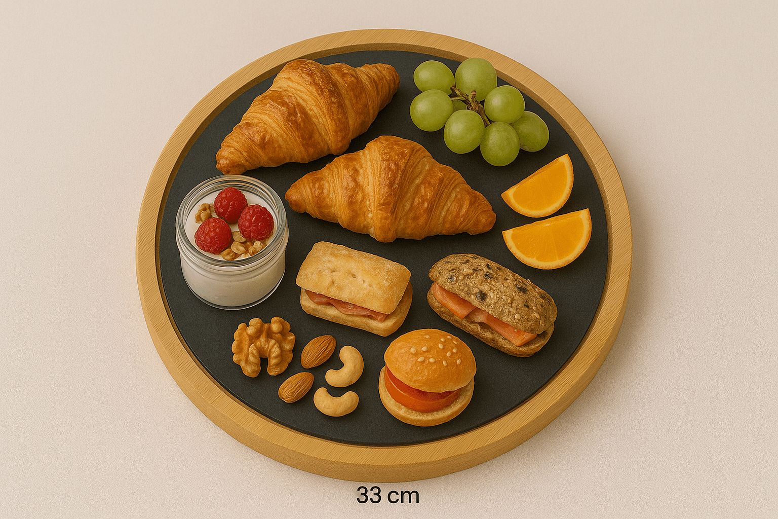 Combina la naturalidad y calidez de la madera de bambú con la sobriedad y elegancia de la pizarra natural. Esta bandeja destaca por su versatilidad: perfecta para servir tapas coloridas, sushi delicado, postres tentadores o frutas frescas con un toque de sofisticación. Su base de bambú aporta firmeza y un estilo orgánico, mientras que la superficie de pizarra resalta cada matiz y textura de los alimentos.