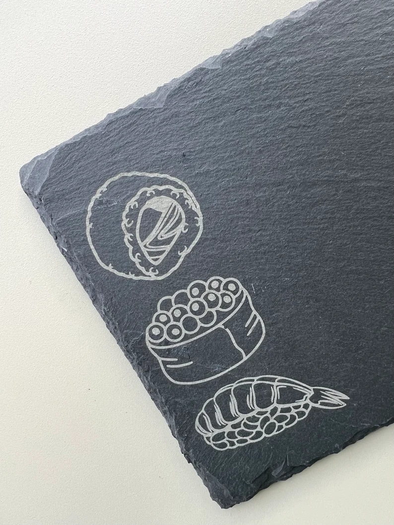 Incluye un plato o bandeja de pizarra grabado en tus cestas regalo o como soporte para presentar tus productos en tienda. Aporta valor y distinción.
