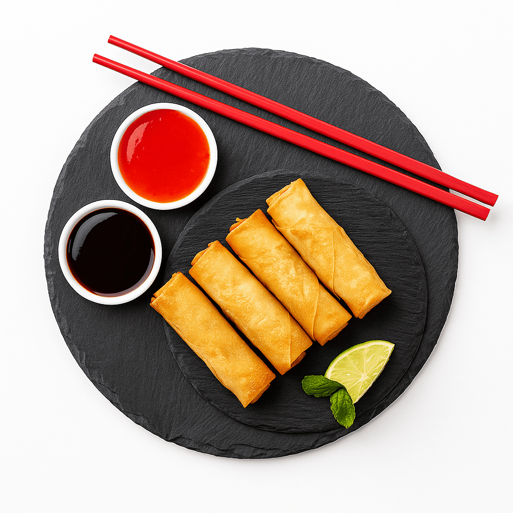 Los platos redondos de pizarra natural de 25 cm son la opción perfecta para transformar cada presentación en una experiencia visual y gastronómica. Su diámetro amplio ofrece un lienzo ideal para realzar platos principales o elaboraciones gourmet, como estos rollitos de primavera acompañados de salsas vibrantes y detalles elegantes.